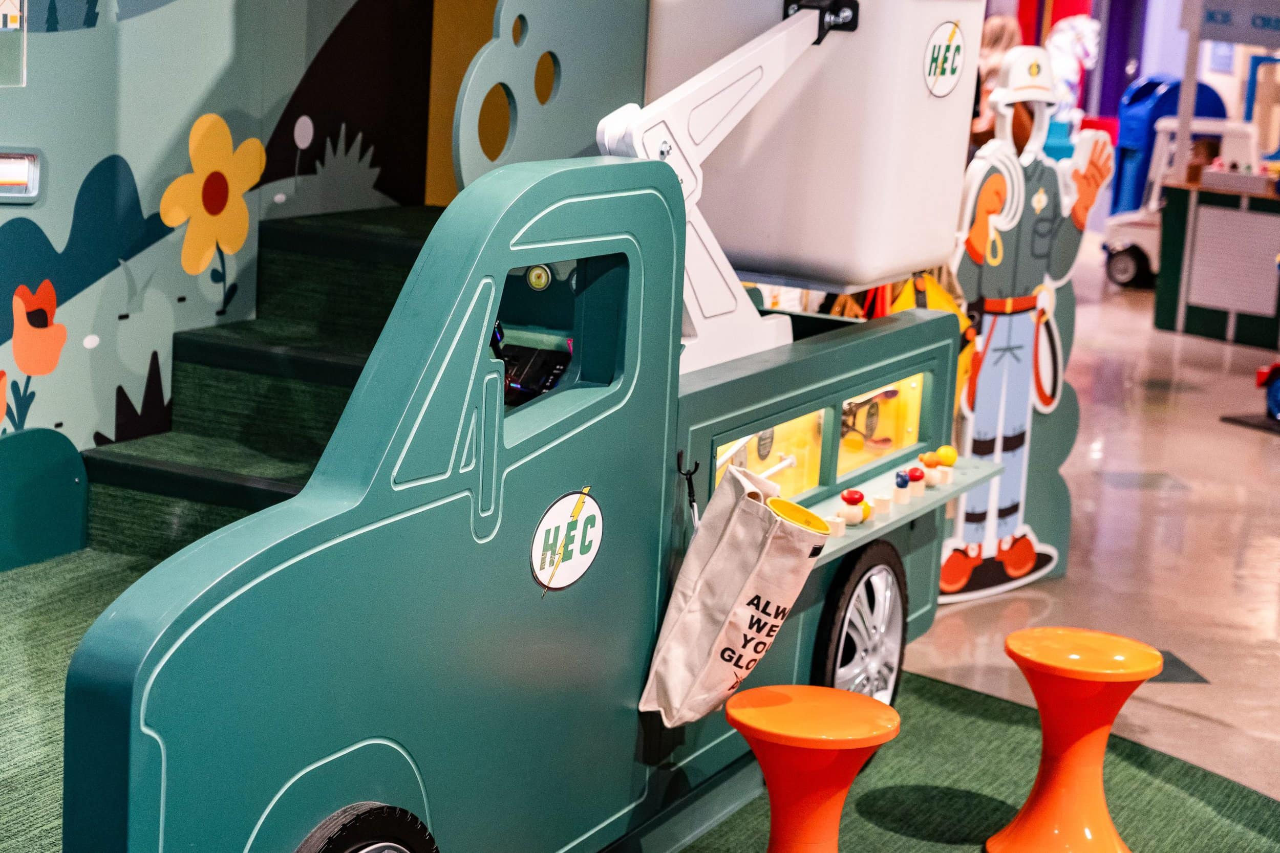 The exhibit highlights different types of energy, including electric and solar, and allows visitors to learn what it takes to bring electricity into homes, and how electricity can be generated. Through hands-on activities and interactive displays, visitors can experience what it’s like to be a line worker, learn how to generate solar energy, and charge an electric vehicle.